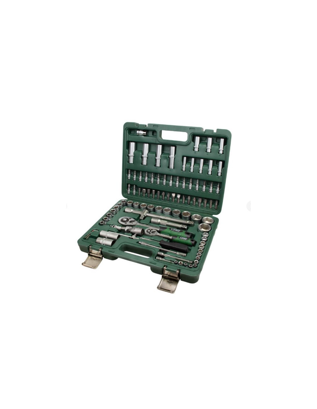 Особливості: Інструменти виготовлені із міцної інструментальної сталі та мають тришарове покриття (Nickel X2 + Chrome); Постачаються в кейсі із міцного АБС-пластику з металевими замками; 1/2" Насадки: 10, 11, 12, 13, 14, 15, 16, 17, 18, 19, 20, 21, 22, 23, 24, 27, 30, 32 мм; Насадки подовжені: 14, 15, 17, 19 мм; Рукоятки з храповим механізмом і 45 зубів; 8"-1/2" з отвором для воротка; Біти: SL: 8.0, 10.0, 12.0 PZ: 3, 4 PH: 3, 4 HEX: 8, 10, 12, 14 1/4" Насадки: 4, 4.5, 5, 5.5, 6, 7, 8, 9, 10, 11, 12, 13, 14 мм; Насадки подовжені: 6, 7, 8, 9, 10, 11, 12, 13 мм; Подовжувачі: 50, 100 мм; Подовжувач гнучкий; Шарнір карданний; Вороток Т-подібний; Викруткова рукоятка; Адаптер для біт 1/4"-1/4"; Ключі шестигранні: 1.5, 2, 2.5 мм; Біти з насадкою: SL: 4.0, 4.5, 7.0 PZ 1, 2 PH: 1, 2 HEX: 3, 4, 5, 6 TORX: T8, T10, T15, T20, T25, T30.