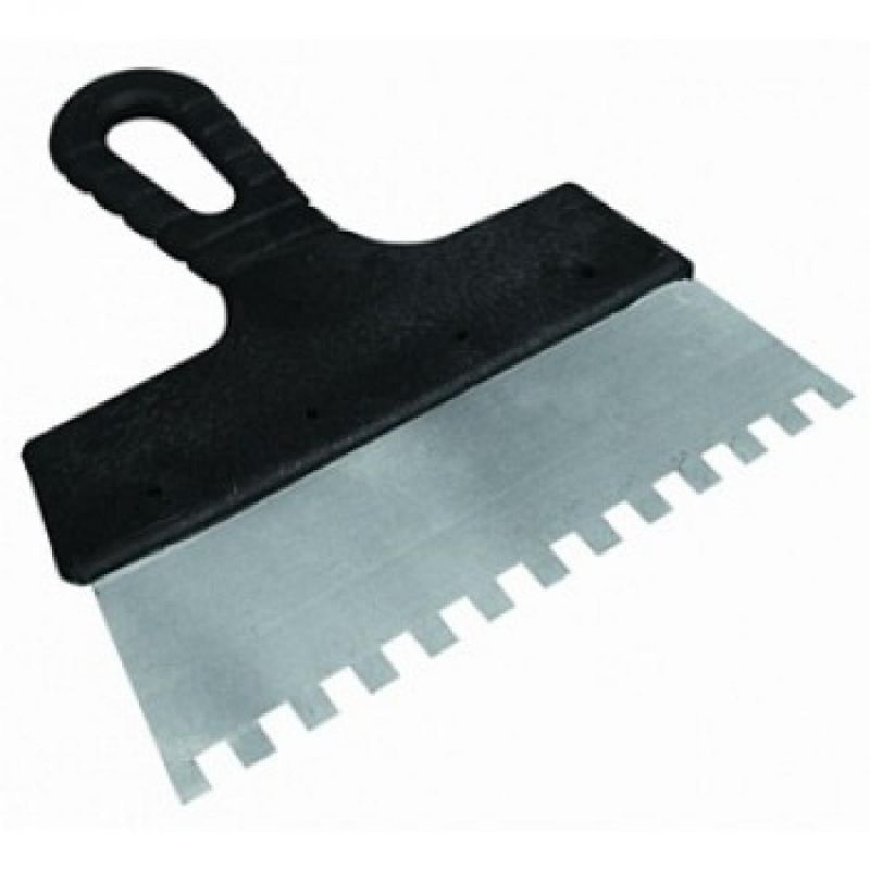 Шпатель с пластмассовой ручкой - лезвие изготовлено из стали , ручка с отверстием для подвешивания. Зуб квадратной формы. Применяется для нанесения клеевых и цементных смесей на керамическую плитку , натуральный камень при проведении облицовочных работ .