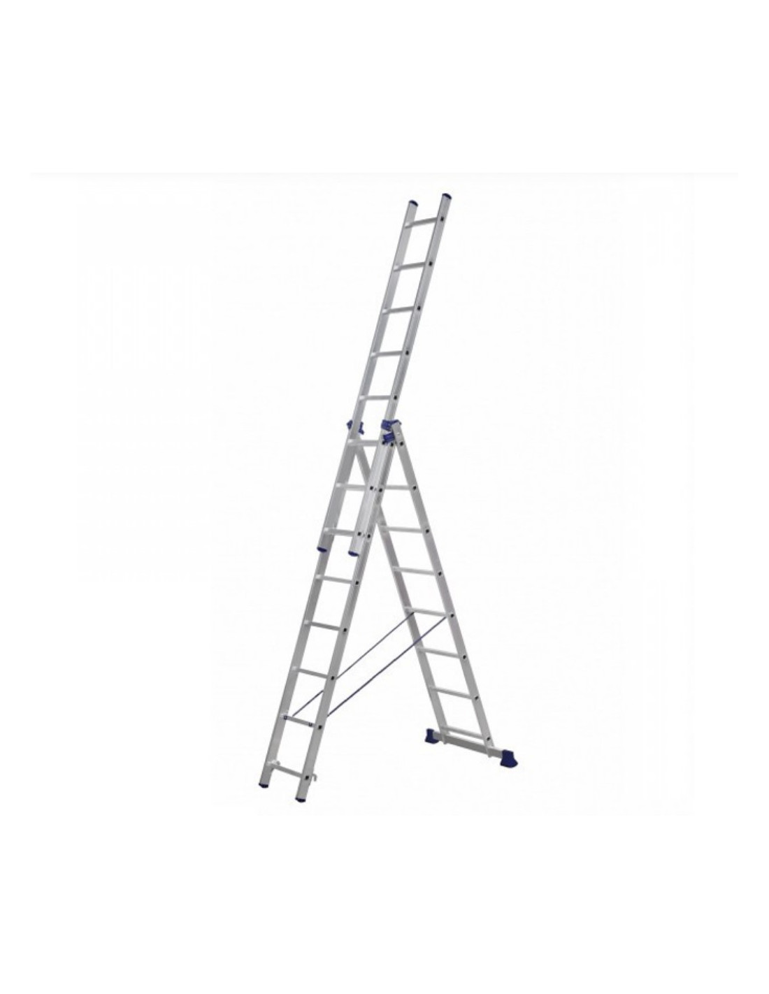 Драбина 3-х секційна універсальна - це алюмінієва конструкція для побутового та промислового застосування з максимальним навантаженнями. Вона незамінна в процесі будівельних, ремонтних, електромонтажних робіт, а також в саду і в домашньому господарстві.Драбина трисекційна оснащена антиковзкими ковпаками на опорних стійках і замком для фіксації секцій. Це надає їй стійкого положення на різних поверхнях. Міцний алюмінієвий профіль встановлюється в різних положеннях і дозволяє знаходити рішення нестандартних завдань.