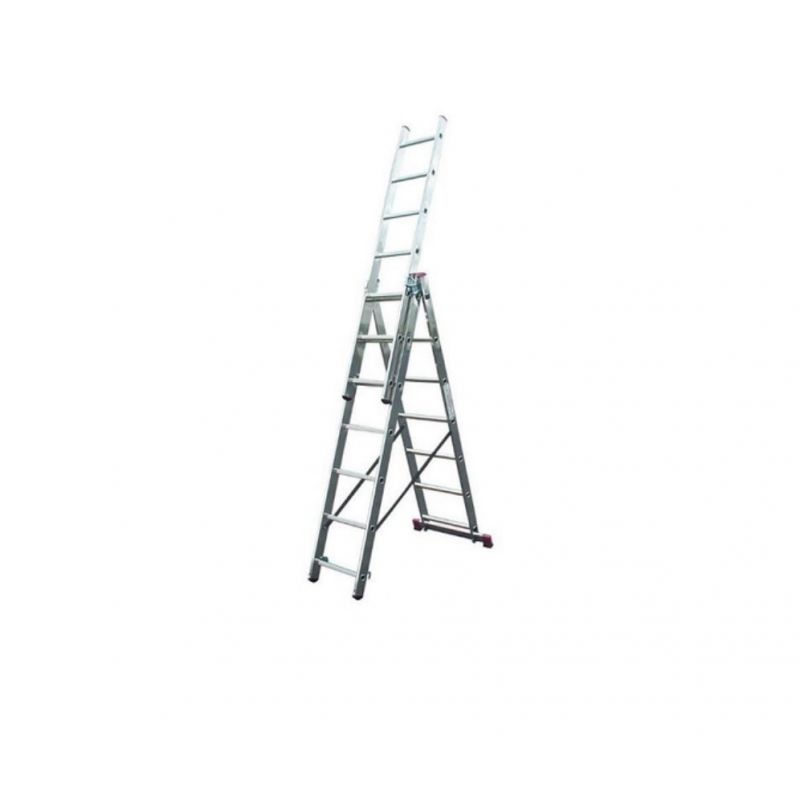Драбина 3-х секційна універсальна - це алюмінієва конструкція для побутового та промислового застосування з максимальним навантаженнями. Вона незамінна в процесі будівельних, ремонтних, електромонтажних робіт, а також в саду і в домашньому господарстві.Драбина трисекційна оснащена антиковзкими ковпаками на опорних стійках і замком для фіксації секцій. Це надає їй стійкого положення на різних поверхнях. Міцний алюмінієвий профіль встановлюється в різних положеннях і дозволяє знаходити рішення нестандартних завдань.