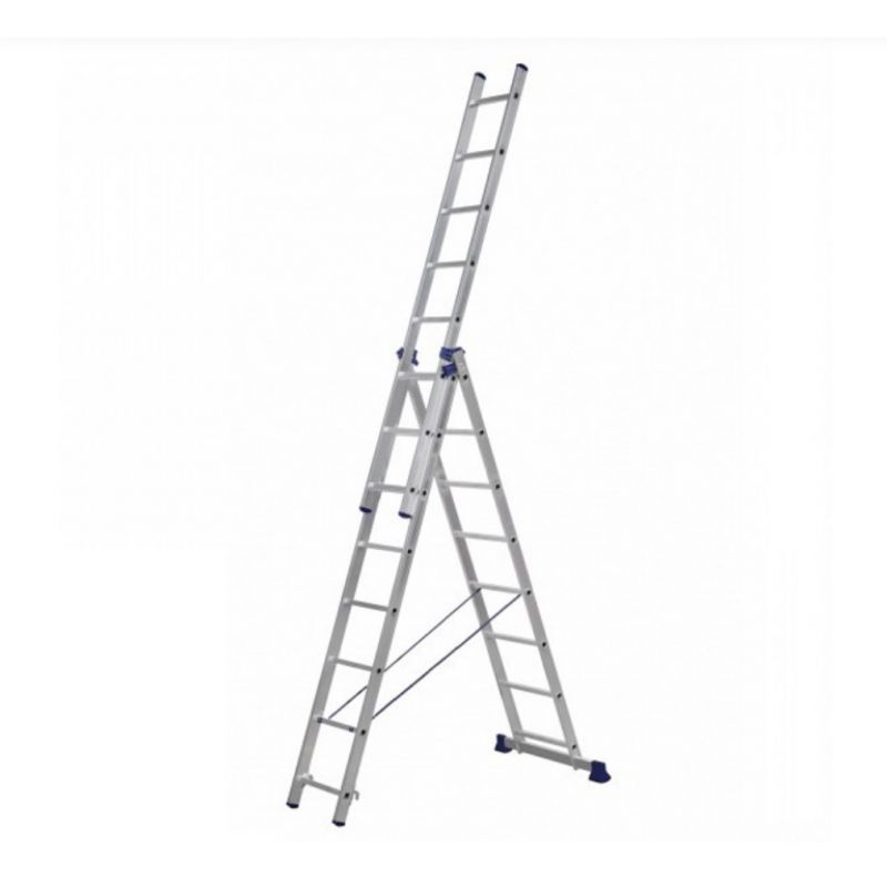 Драбина 3-х секційна універсальна - це алюмінієва конструкція для побутового та промислового застосування з максимальним навантаженнями. Вона незамінна в процесі будівельних, ремонтних, електромонтажних робіт, а також в саду і в домашньому господарстві.Драбина трисекційна оснащена антиковзкими ковпаками на опорних стійках і замком для фіксації секцій. Це надає їй стійкого положення на різних поверхнях. Міцний алюмінієвий профіль встановлюється в різних положеннях і дозволяє знаходити рішення нестандартних завдань.